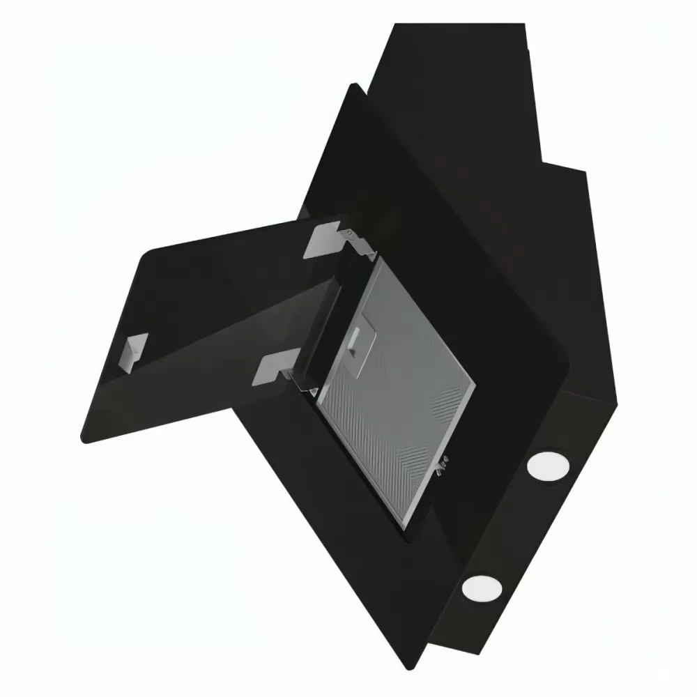 Антивозвратный клапан предотвращает проникновение запаха из общего вентиляционного канала. Вытяжка оснащена индикаторами выбранной скорости. Две светодиодные лампы обеспечивают удобство во время приготовления пищи. Модель выполнена из металла и стекла, оснащена проводом длиной 1,75 м.